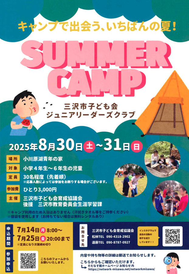 三沢市子ども会育成協議会では、中高生リーダーが企画・運営するサマーキャンプを開催します。